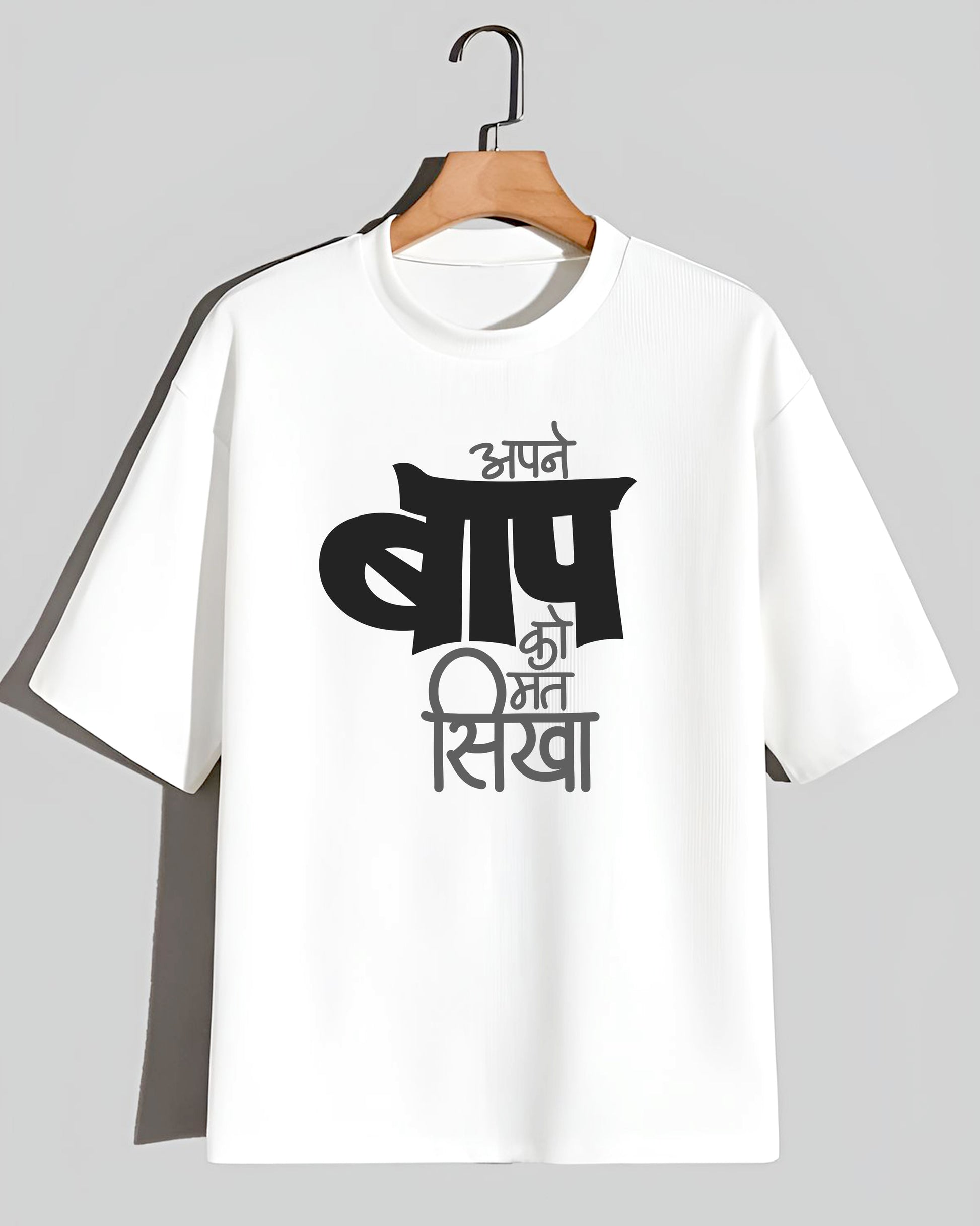 Baap ko mat sikha- Unisex Oversized Classic White Tee (Black Graphic printed)