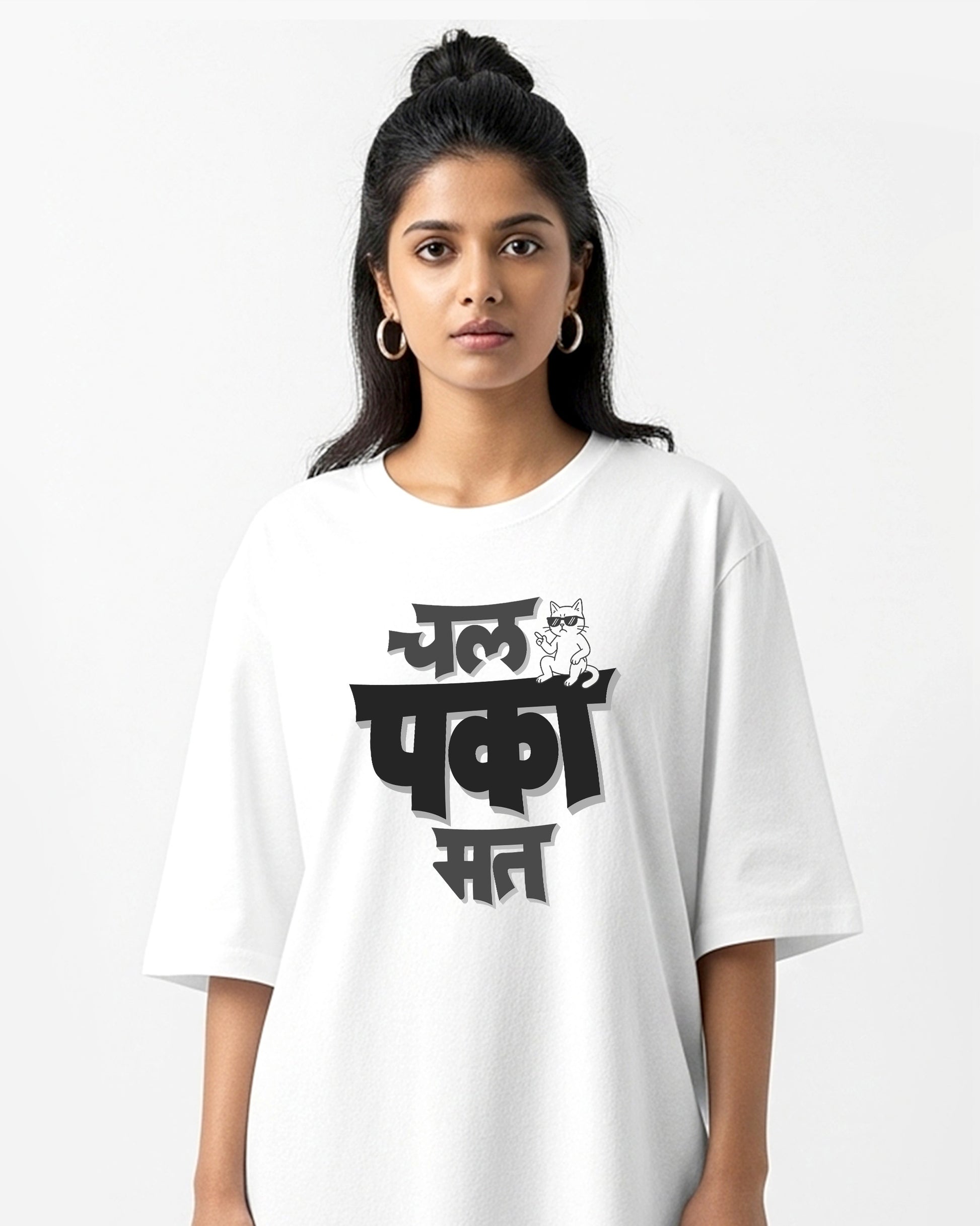 Chal paka mat- Unisex Terry Oversized White Tee (Black-Graphic printed)